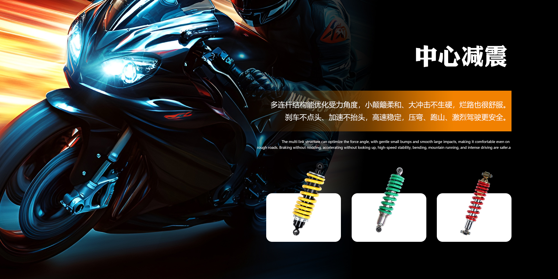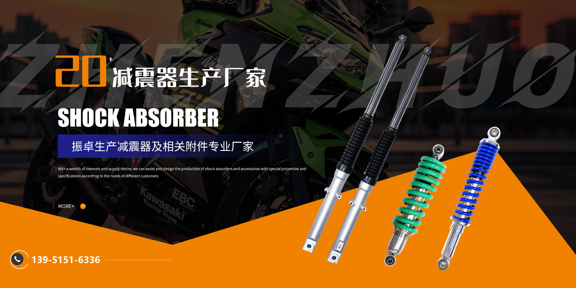 目前公司主营产品有前减震器、后减震器、方向柱、上联板、灯架,转向手把等超过100多个国内外主流和冷门车型减震器及配件,真正做到了产品的专业性和多元化。同时,拥有丰富的渠道和供应链能根据不同客户的需求,协助并设计生产拥有特殊性能和规格的减震器及配件,始终以“优质质量,开拓创新,精益求精,客户放心”的宗旨,与国内外众多知名主机厂及客户携手发展,共同开拓!